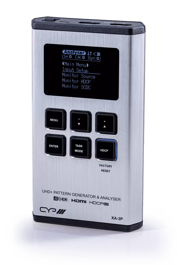 XA-3P är en avancerad HDMI "mönster generator" och analysator för att felsöka diverse problem inom HDMI och dess överföring. Den innehåller dessutom en kabeltestare som mycket enkelt gör att man kan kontrollera om en kabel håller måttet.